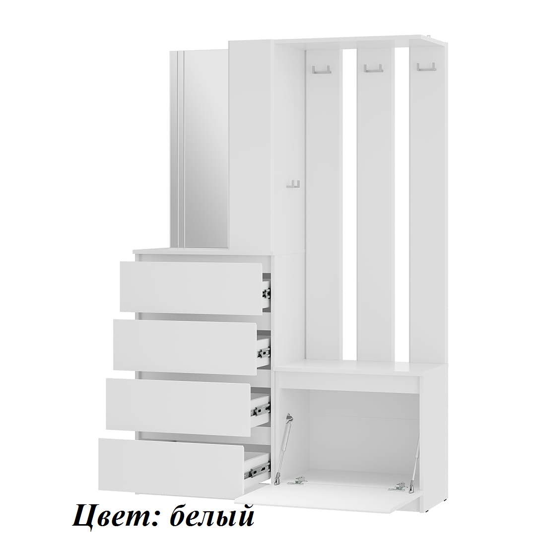 Прихожая «Симпл» (ПР-04) — конструкция продумана до мелочей. Комплект оснащен всем необходимым для комфортного размещения вещей в прихожей. Впишется как в просторное, так и в небольшое помещение. Под зеркалом в минималистичном дизайне — четыре выдвижных ящика, в которых можно хранить шарфы, шапки и другие нужные аксессуары. Еще одна нижняя полка подойдет для хранения сезонной обуви, а три открытых полки рядом с зеркалом — для ключей. Несколько крепких крючков для верхней одежды. Нижняя откидная створка - на кронштейнах.