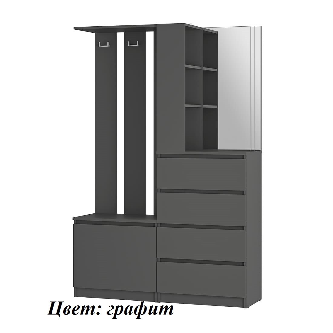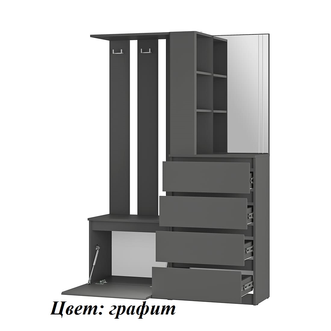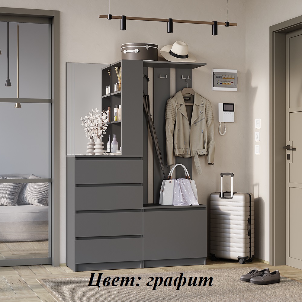 Прихожая «Симпл» (ПР-04) — конструкция продумана до мелочей. Комплект оснащен всем необходимым для комфортного размещения вещей в прихожей. Впишется как в просторное, так и в небольшое помещение. Под зеркалом в минималистичном дизайне — четыре выдвижных ящика, в которых можно хранить шарфы, шапки и другие нужные аксессуары. Еще одна нижняя полка подойдет для хранения сезонной обуви, а три открытых полки рядом с зеркалом — для ключей. Несколько крепких крючков для верхней одежды. Нижняя откидная створка - на кронштейнах.