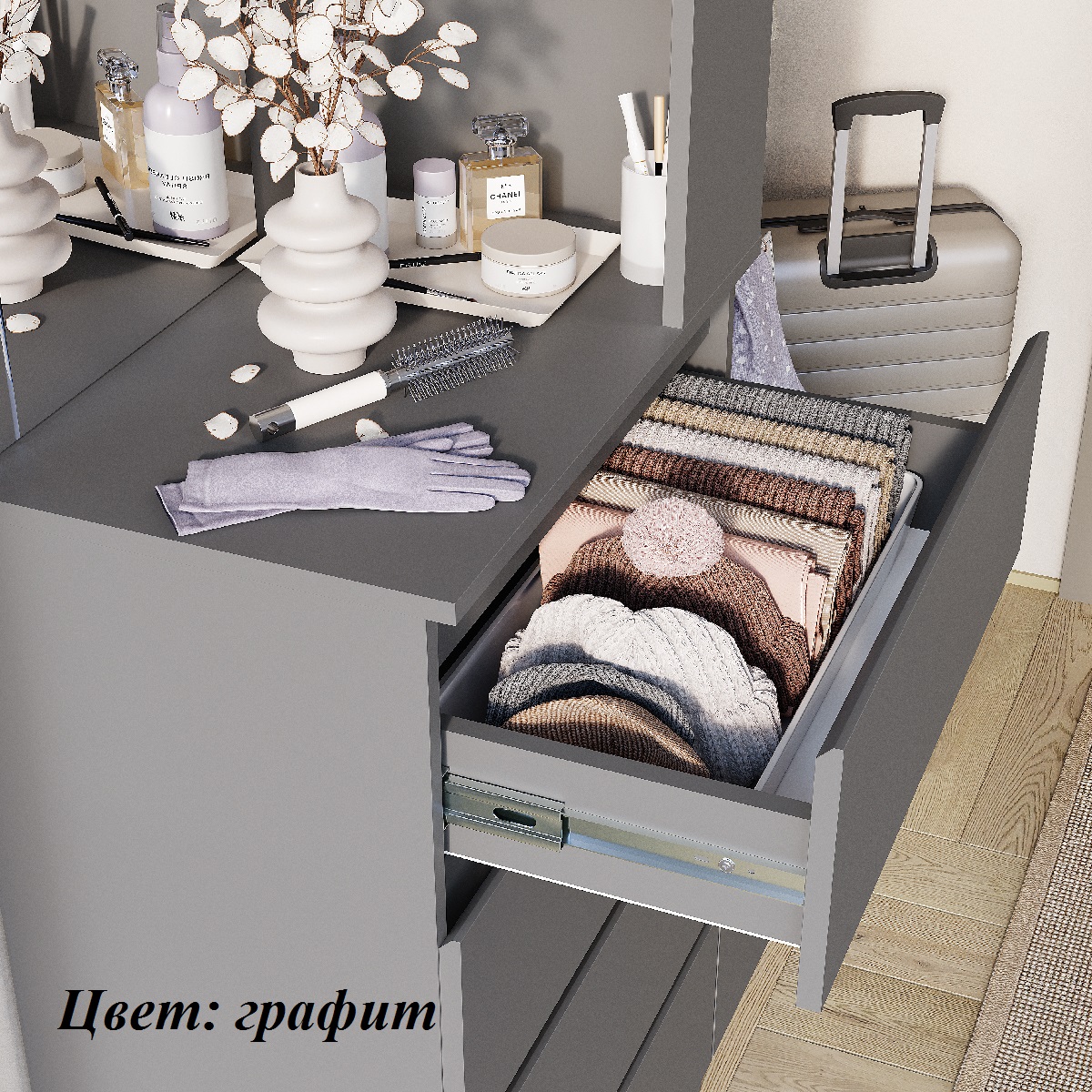 «Симпл» - это современная коллекция функциональной мебели. В ней собраны все необходимые предметы для интерьера спальни, гостиной и личной комнаты: шкафы, кровати, комоды, столы, тумбы. Также в состав композиции входят малые формы, которые станут изюминкой вашего дома. Коллекция полностью соответствует своему названию. Отсутствует лицевая фурнитура. Мебель, выполненная в спокойных оттенках «белый» и «графит», идеально дополнит как классический, так и современный интерьер. Коллекция отличается практичностью и функциональностью. Полноценный набор мебели позволяет экспериментировать с пространством. Интегрированный срез на фасадах. Мебель этой коллекции оснащена надежными опорами из безопасного пластика – это позволит не только комфортно проводить влажную уборку, но и уберечь напольное покрытие от повреждений. Выдвижные элементы коллекции оснащены шариковыми направляющими.