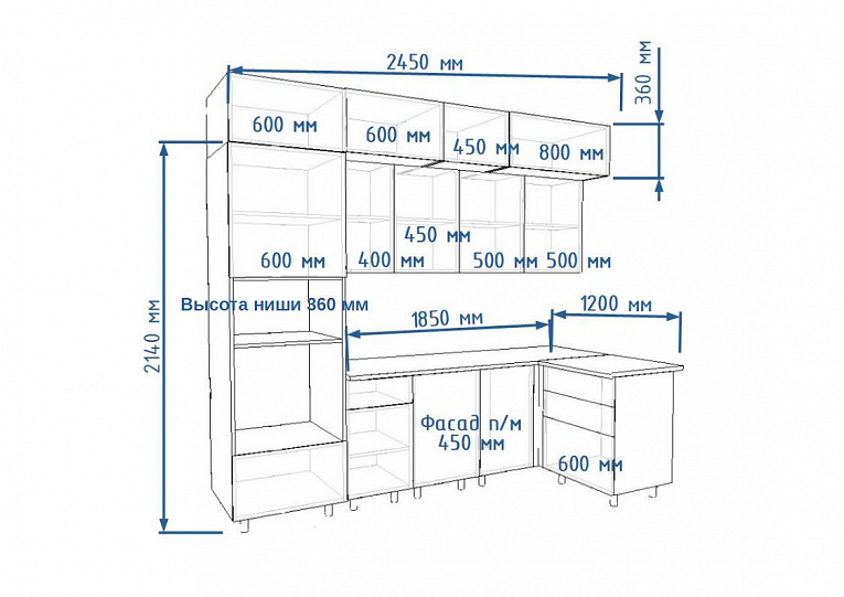 Описание Кухонный гарнитур арт. 6 Тальк – РоялВуд Голубой 2450х1200 мм.