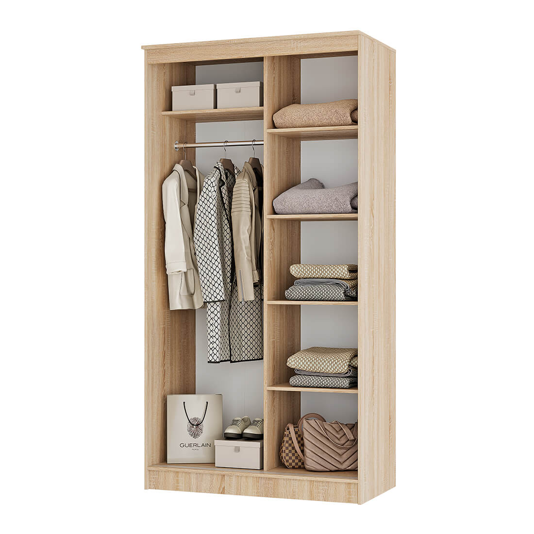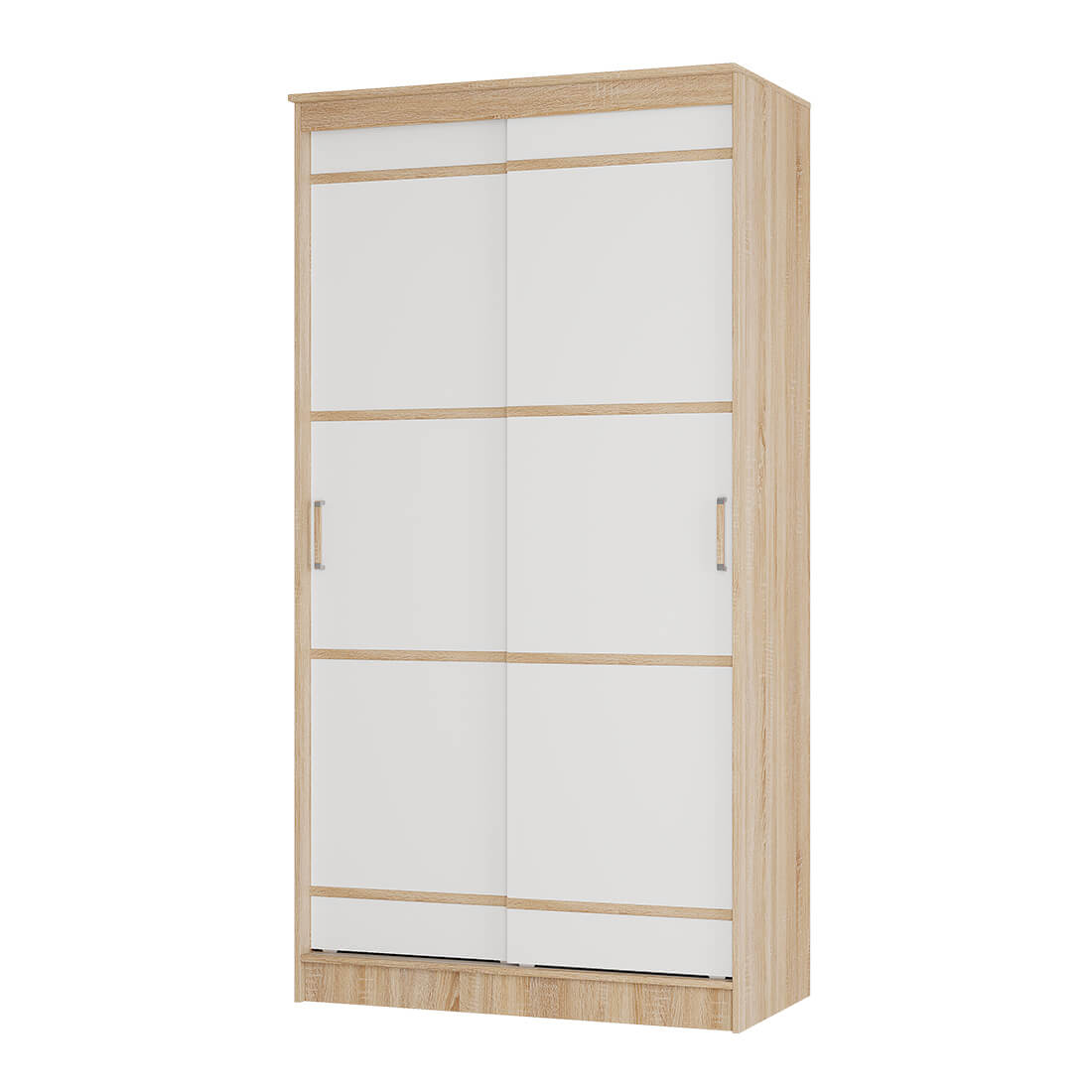 Шкаф-купе "Сакура" выполнен в едином стиле с остальными модулями одноимённой мебельной серии. Он сделан из ЛДСП высокого качества в комбинации цветов "сонома" и "белый", раздвижные дверцы декорированы темными полосами и дополнены удобными ручками. Внутри модель содержит все необходимые зоны для хранения одежды и обуви: отделение для плечиков, а также полки и ниши для остальных вещей.