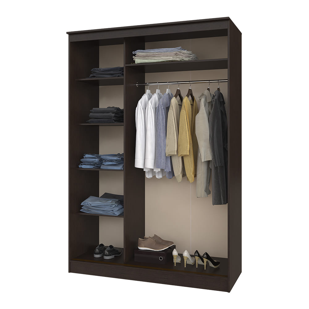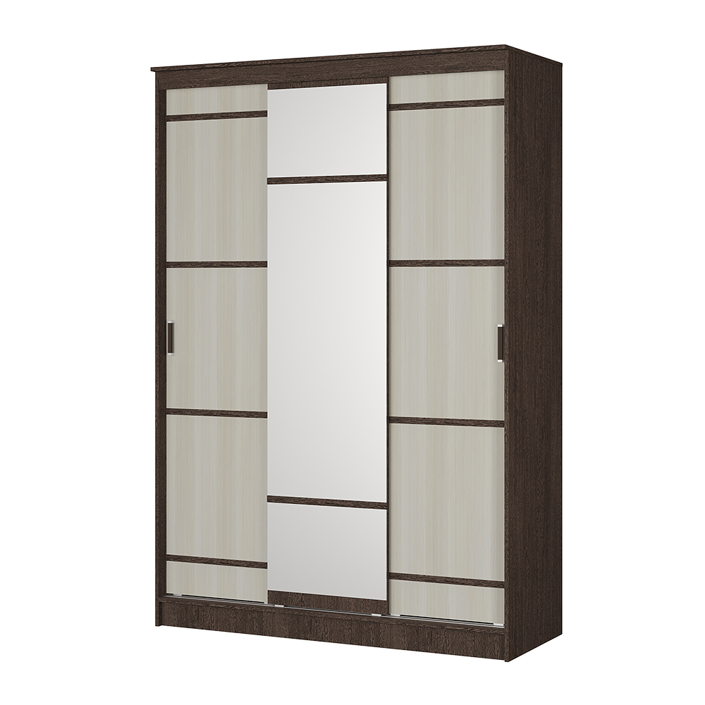 Шкаф-купе "Сакура" выполнен в едином стиле с остальными модулями одноимённой мебельной серии. Он сделан из ЛДСП высокого качества в комбинации цветов "венге" и "лоредо", раздвижные дверцы декорированы темными полосами и дополнены удобными ручками, центральная створка – полностью зеркальная. Внутри модель содержит все необходимые зоны для хранения одежды и обуви: большое отделение для плечиков, а также полки и ниши для остальных вещей.